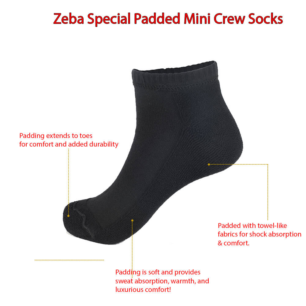 Introducing the Zeba Special Padded Socks, designed with a thick towel-like material on the bottom for added comfort and shock absorption. These durable socks not only offer excellent support for various activities but also help keep your feet dry and odor-free with their moisture-wicking properties. Upgrade your sock game with our Special Padded Socks for a comfortable and long-lasting experience.